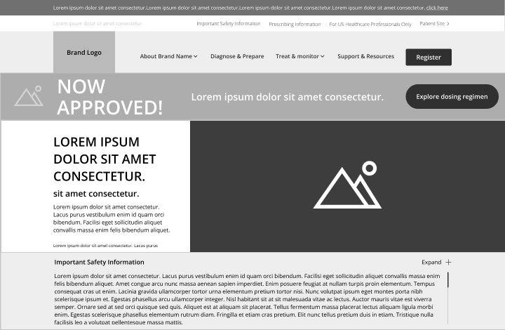 Visuals shown in greyscale wireframe, and copy is ‘greeked’ for confidentiality.